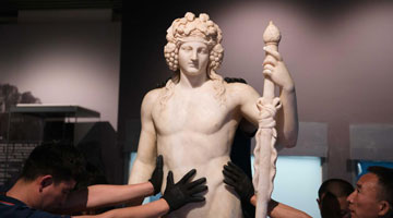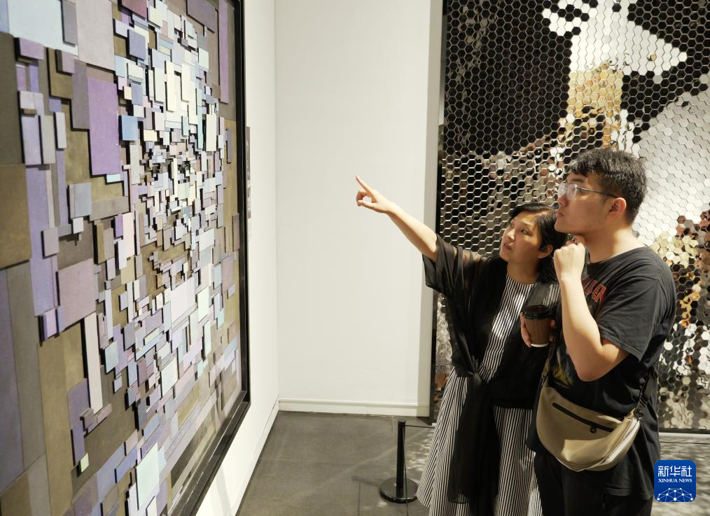 7月12日,参观者在第十四届全国美术作品展览壁画作品展上观看作品《源远流长》。