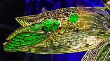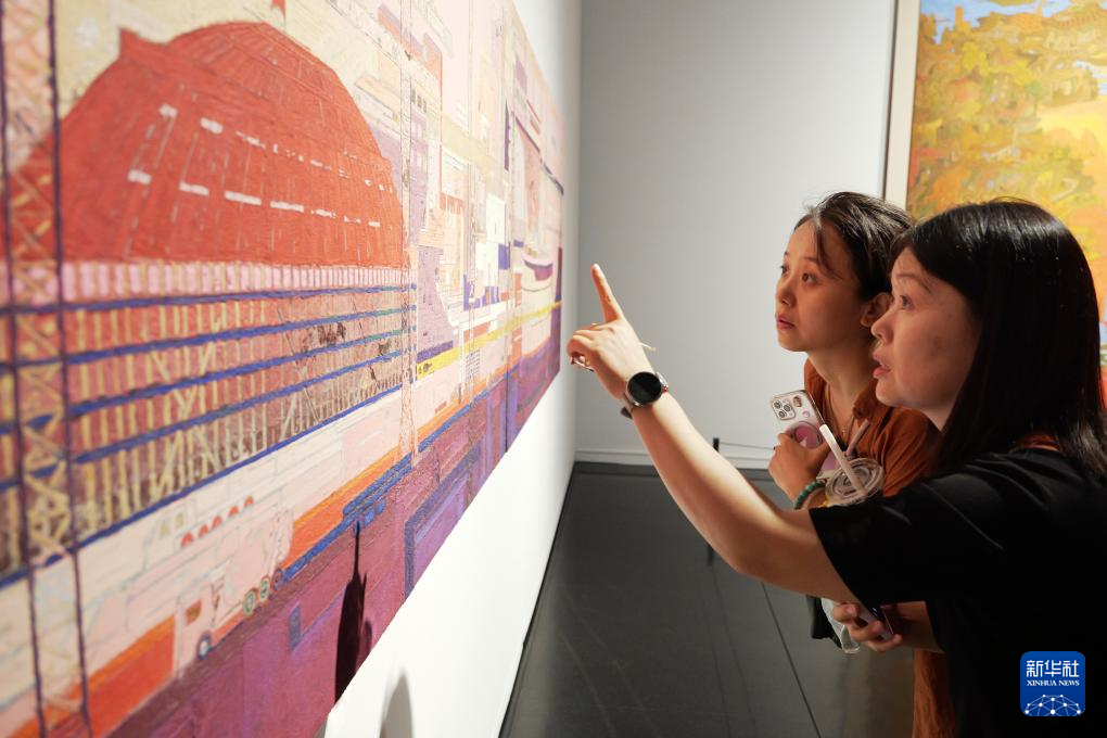 7月12日,观众在第十四届全国美术作品展览壁画作品展观看作品《日出东方·建设中的华龙一号》。
