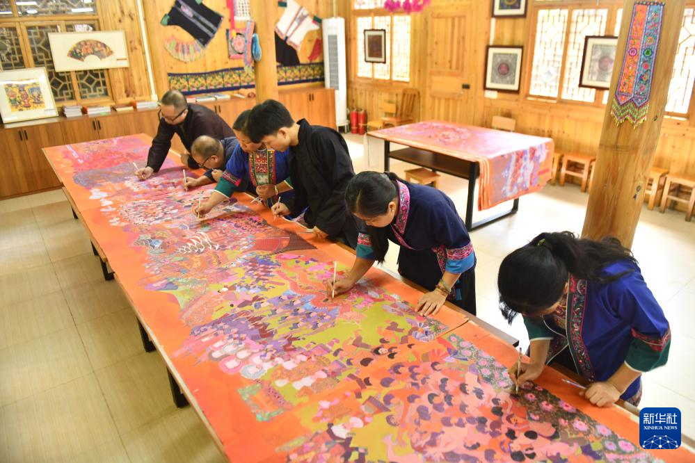 在广西三江侗族自治县民族实验学校农民画工作坊,侗族农民画作者在集体创作长卷作品《侗乡百节》(7月30日摄)。