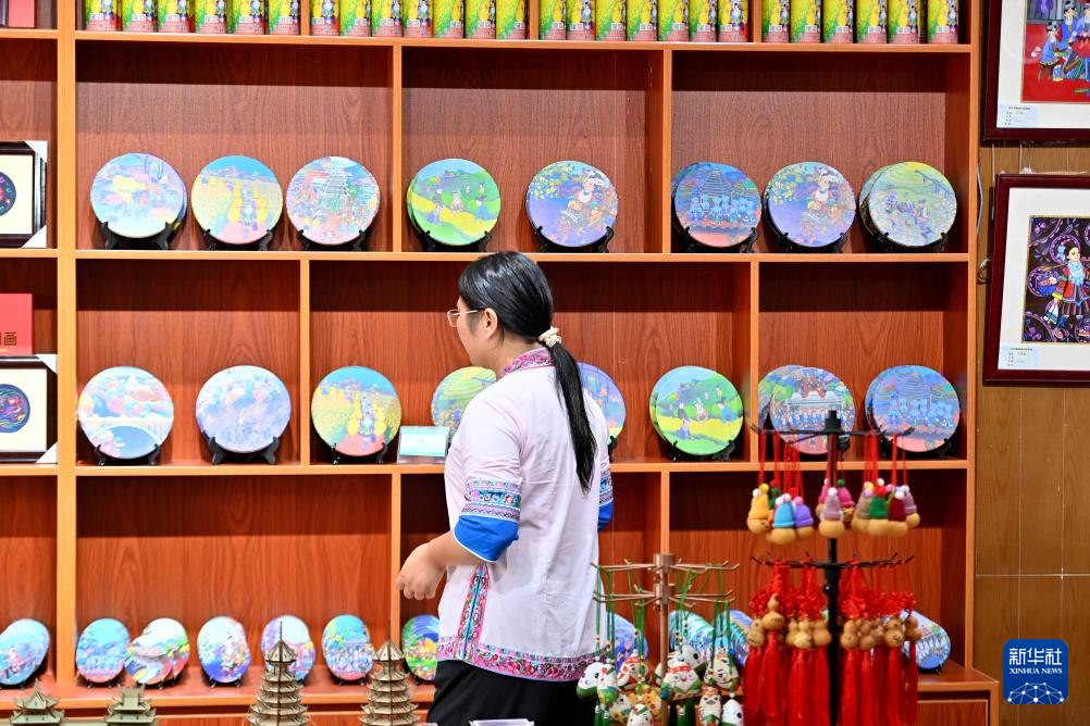 在广西三江侗族自治县一家非遗文创超市,侗族农民画作者在整理农民画文创产品(7月30日摄)。