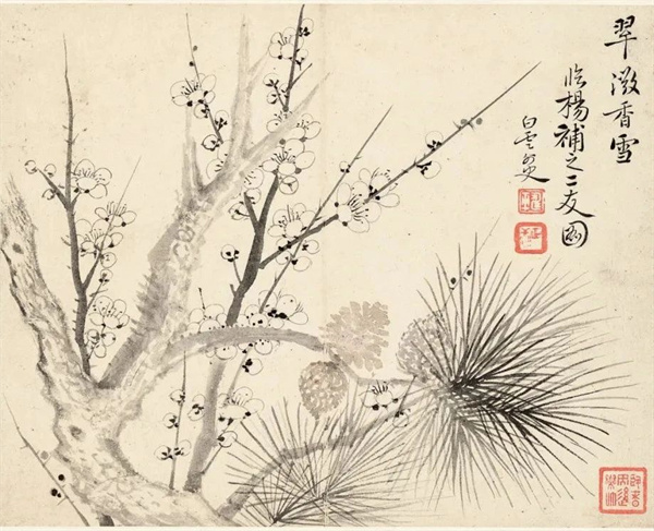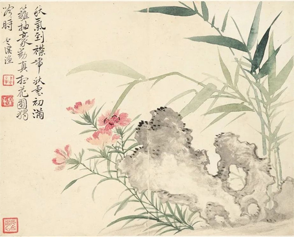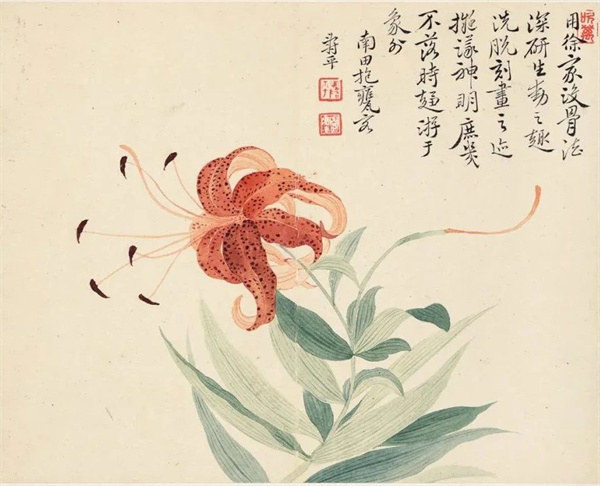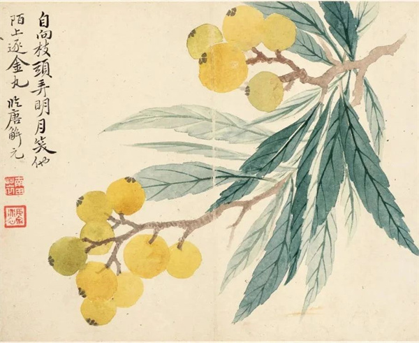 恽寿平的《瓯香馆写生册》,天津博物馆藏,描写了四时的花果。从春夏到秋冬分别是桃花、海棠、碧海珊瑚、牡丹、枇杷、卷丹、洛阳花、凤仙花、菊花、梅花。作品用笔清劲秀逸,而不见笔墨痕迹,设色醇厚鲜丽,清新古雅,令人眼目一新。