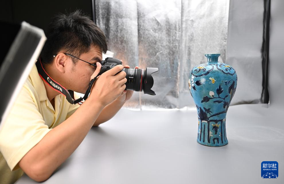 8月27日,中国(海南)南海博物馆的工作人员胡宝为文物拍照。