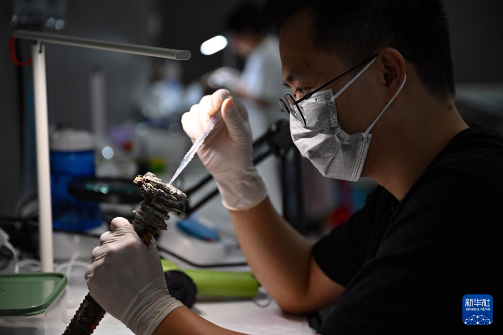 8月27日,中国(海南)南海博物馆的工作人员颜建超在修复文物。