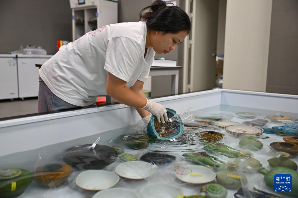 8月27日,国家文物局考古中心的工作人员冯清慧将文物放入脱盐池。