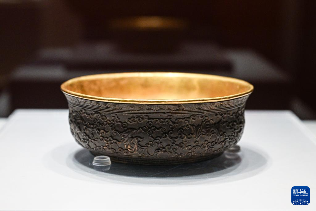 8月31日在海南省博物馆拍摄的“物华天宝 黎海琼珍——故宫博物院藏海南文物特展”展出的清代椰子木雕云蝠纹镶金里碗。