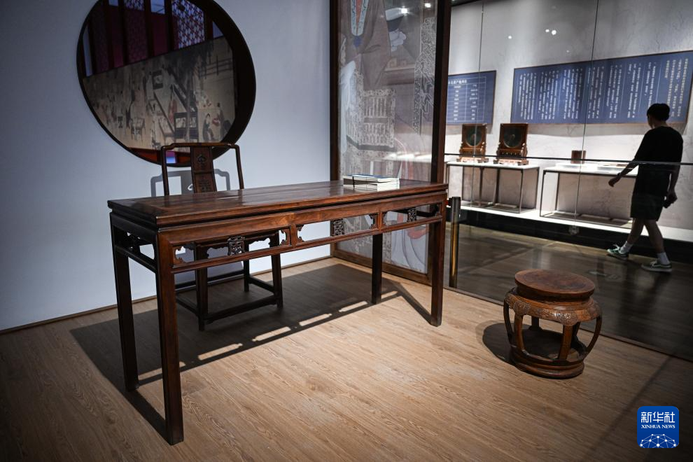 8月31日在海南省博物馆拍摄的“物华天宝 黎海琼珍——故宫博物院藏海南文物特展”展出的清代黄花梨木椅、黄花梨木画桌和黄花梨木雕花纹圆杌。