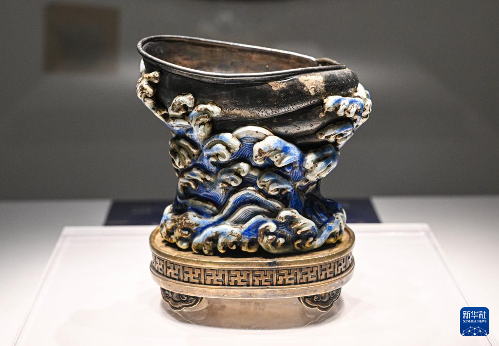8月31日在海南省博物馆拍摄的“物华天宝 黎海琼珍——故宫博物院藏海南文物特展”展出的清代乾隆款银烧蓝海螺式水丞。