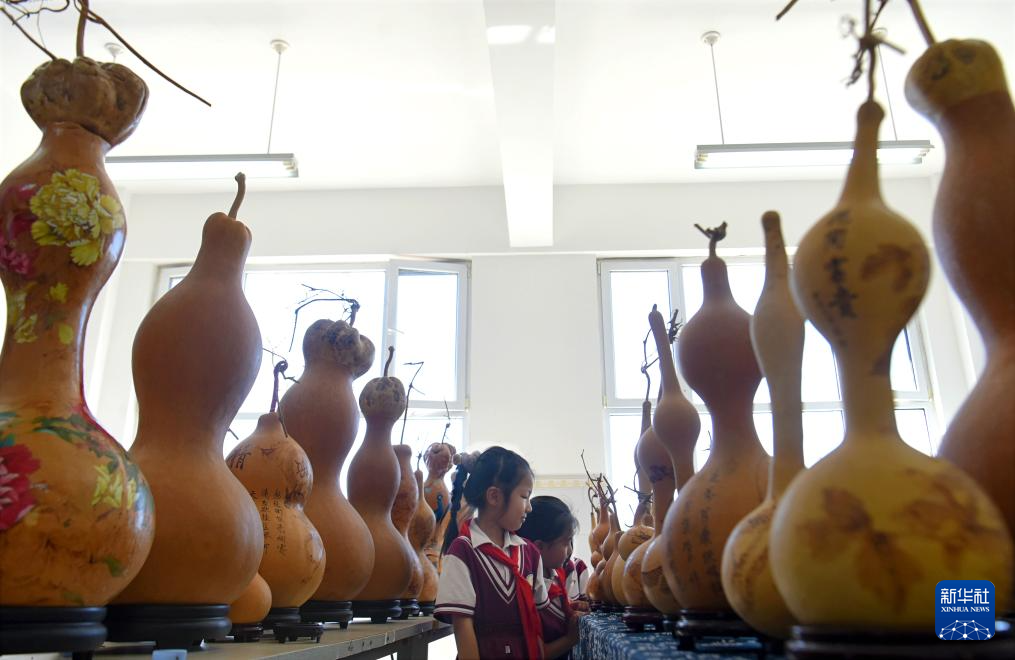9月6日,在山东省淄博市沂源县南鲁山镇土门中心学校,学生们在欣赏老师创作的烙画葫芦。