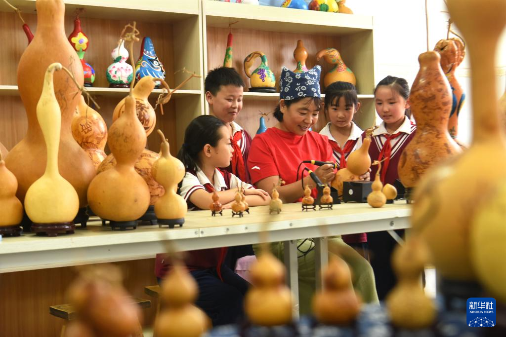9月5日,在山东省淄博市沂源县南鲁山镇土门中心学校,朱庆凤(中)向学生传授葫芦烙画创作技艺。