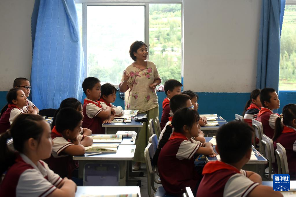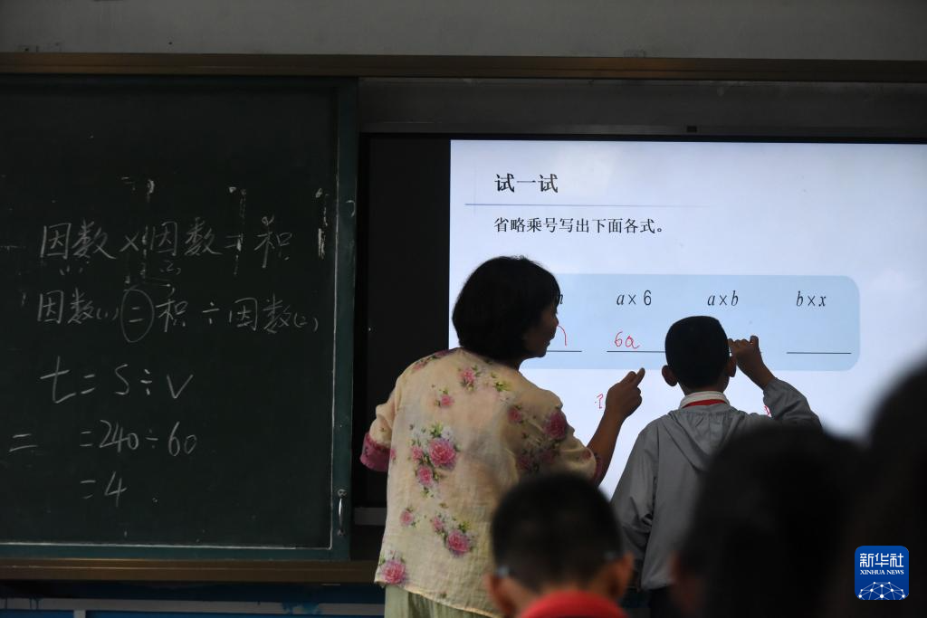 9月5日,在山东省淄博市沂源县南鲁山镇土门中心学校,朱庆凤(左)为一名学生辅导数学。