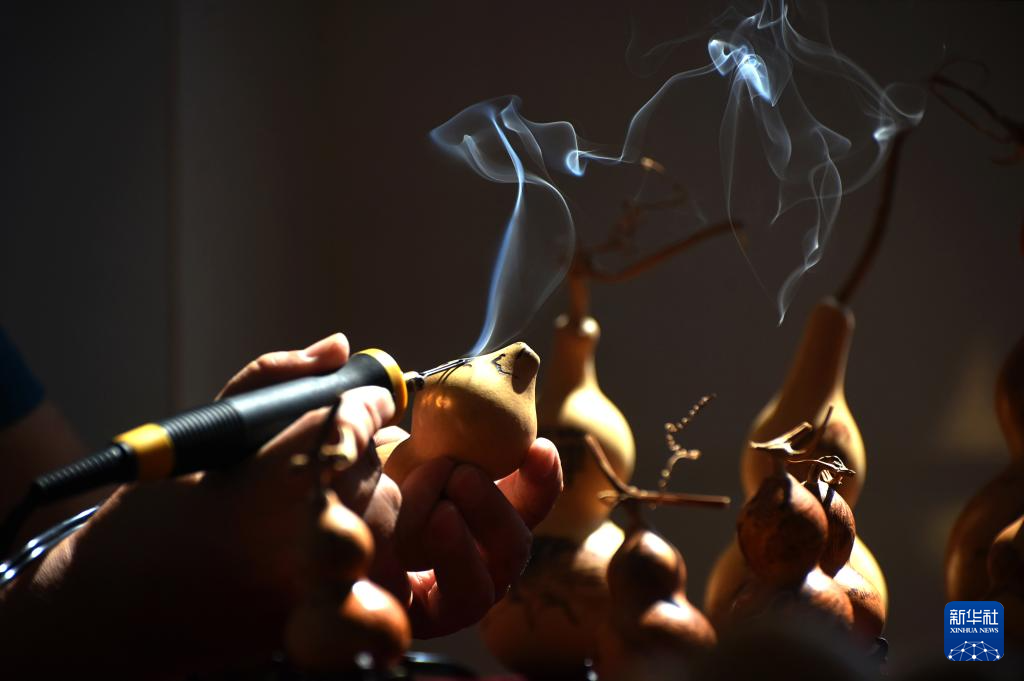 9月6日,在山东省淄博市沂源县南鲁山镇土门中心学校,朱庆凤在创作葫芦烙画。