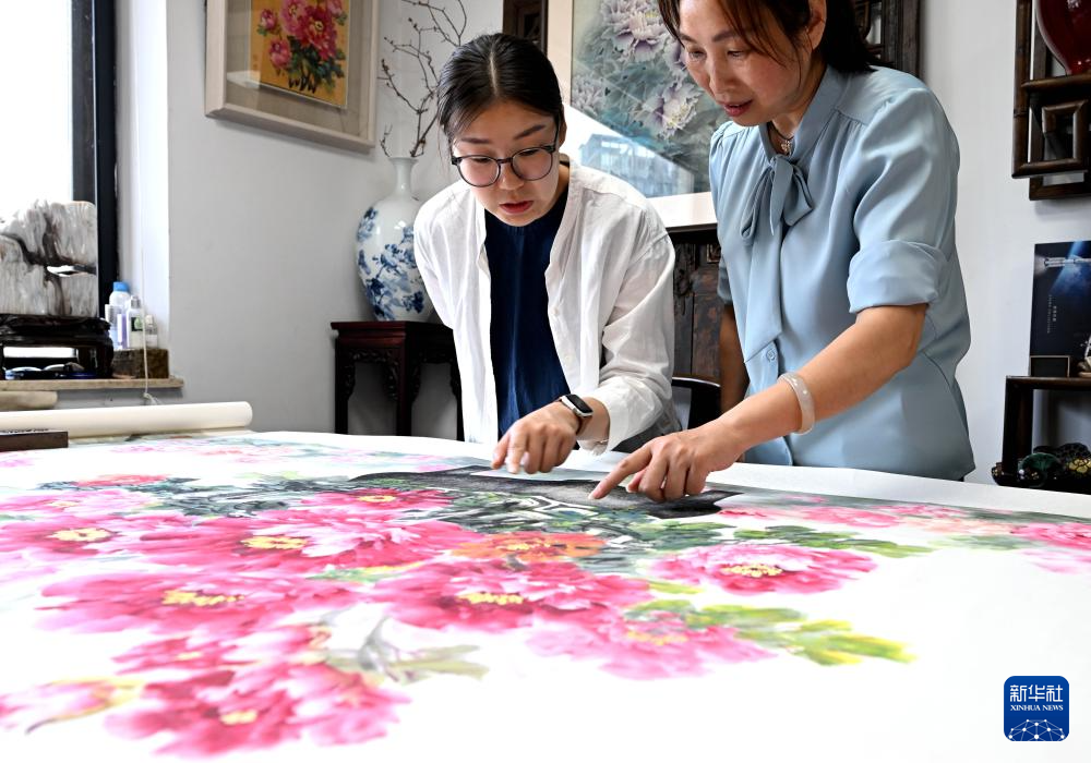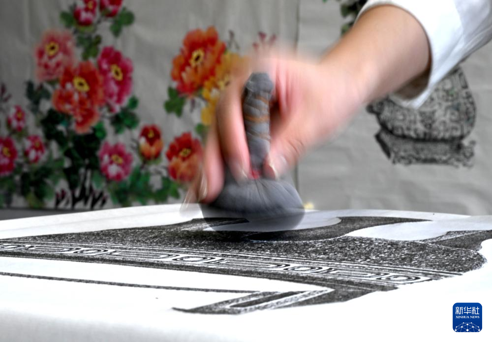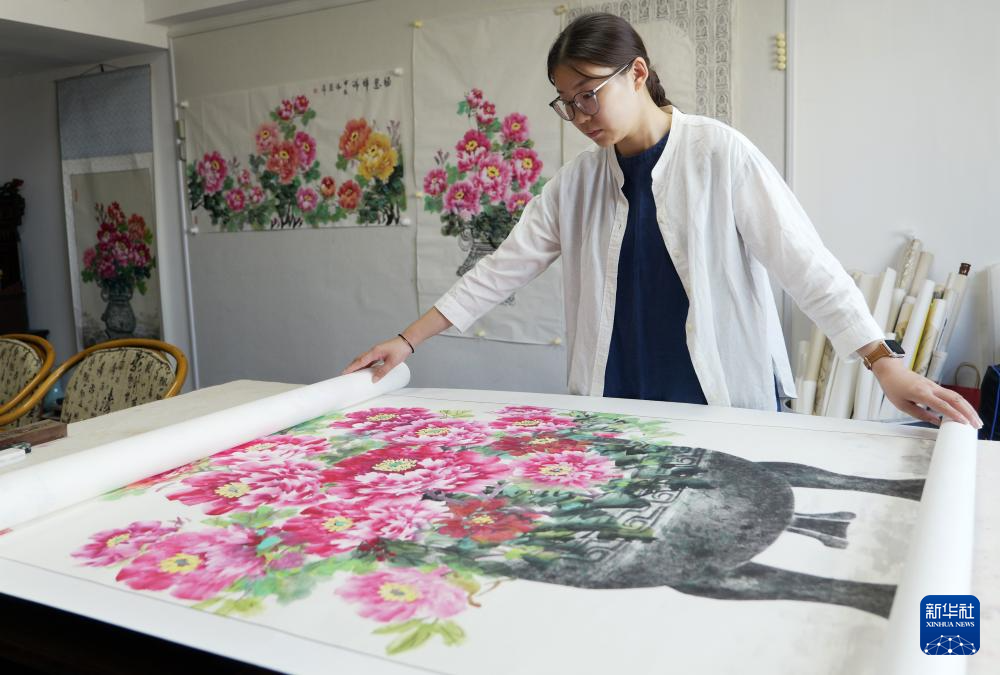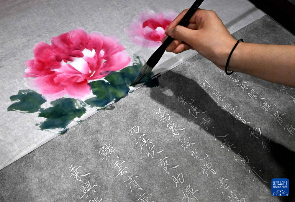 在洛阳华夏金石文化博物馆,钱夏玉在拓印完成的金石拓片上补绘牡丹画(9月11日摄)。