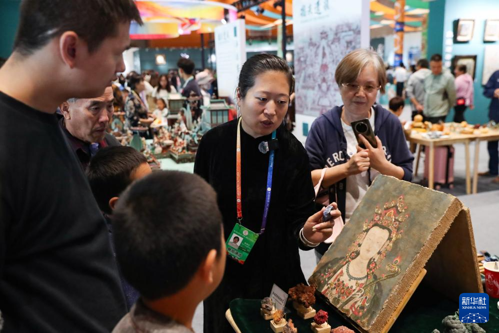 9月22日,在匠心传承·创意绽放——非遗及文创精品展上,敦煌石粉彩绘非遗传承人为游客介绍一件敦煌壁画文创产品。