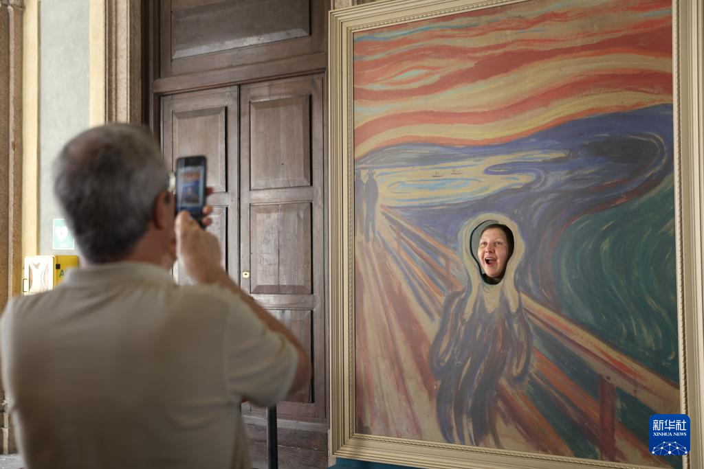 9月22日,在意大利米兰王宫,观众与蒙克画作《呐喊》互动装置合影。