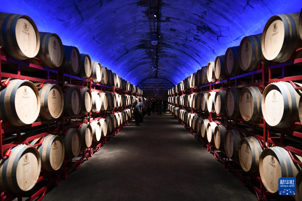 10月17日,参观者在位于山东烟台的张裕酒文化博物馆张裕百年酒窖内品酒。