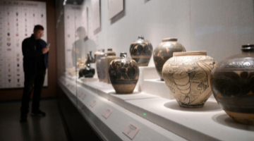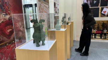 11月4日,在新闻中心进行音乐表演的中外艺术家演出结束后观看展出的文创产品。