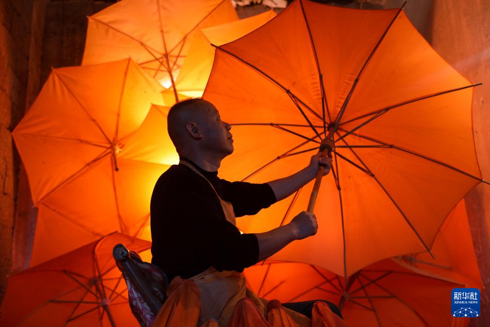 11月13日,在泾县昌桥乡孤峰村,国民油布伞厂的工人在晾晒油布伞。