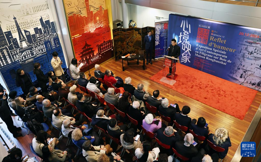 这是12月20日在法国巴黎中国文化中心拍摄的“心境映象——荣宝斋当代艺术展暨木版水印特展”开幕式现场。