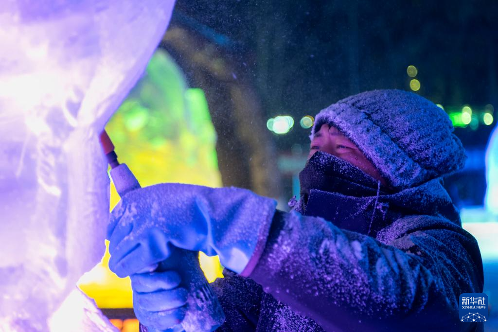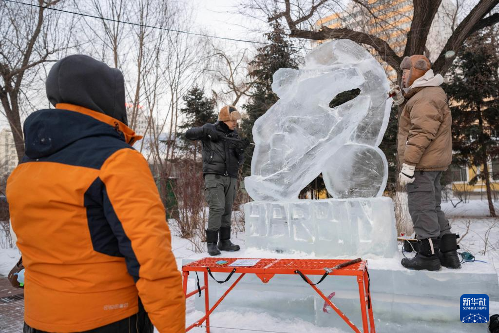 1月2日,在哈尔滨市道里区,冰雕师在兆麟公园内雕琢2025年哈尔滨亚冬会主题冰雕作品。
