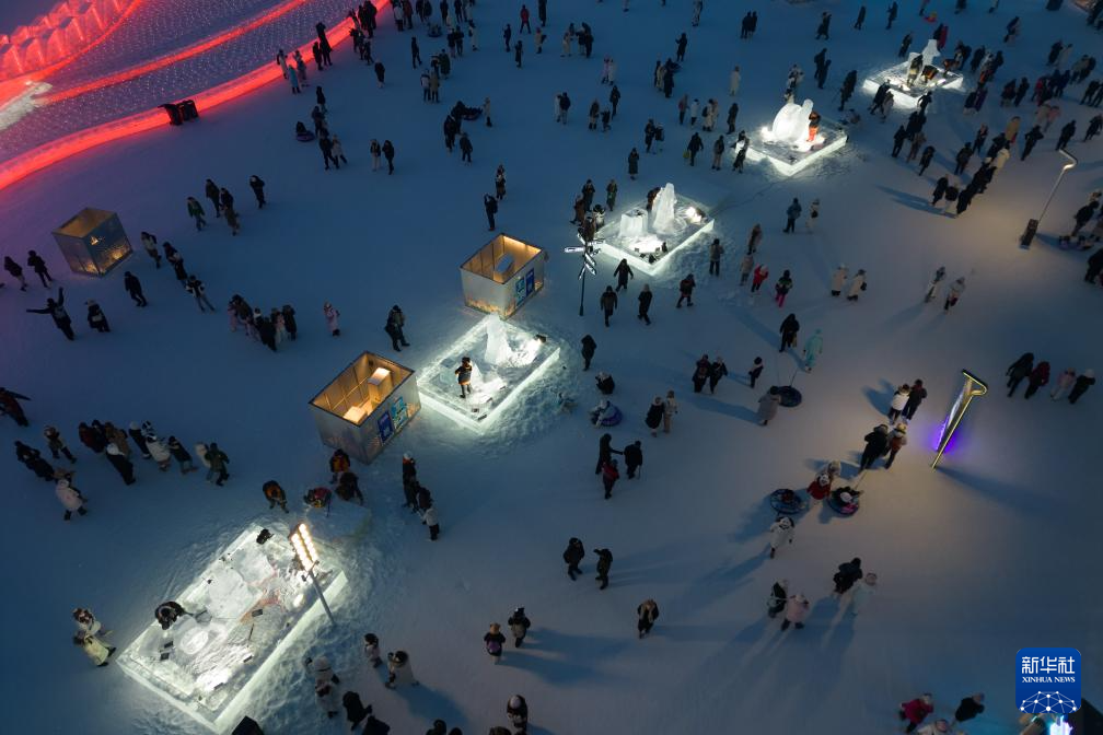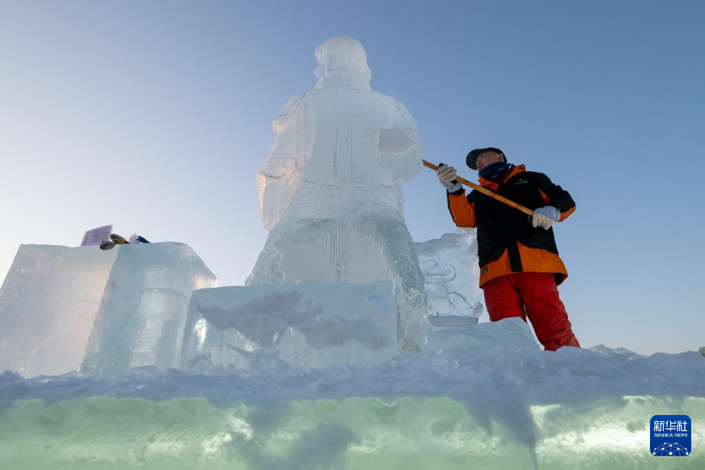 1月4日,在哈尔滨冰雪大世界园区,大庆师范学院美术与设计学院冰雕团队的成员在雕刻“冰马俑”。
