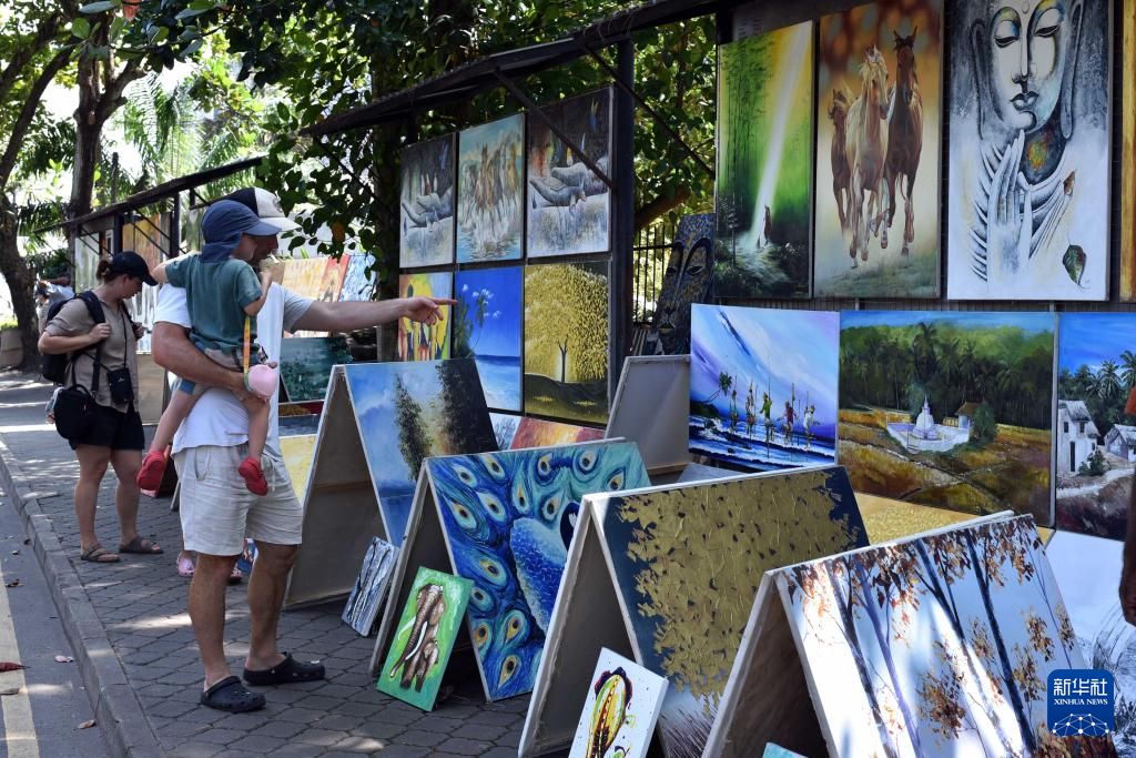 1月8日,人们在斯里兰卡科伦坡市中心“绿径”街头艺术画廊前欣赏画作。