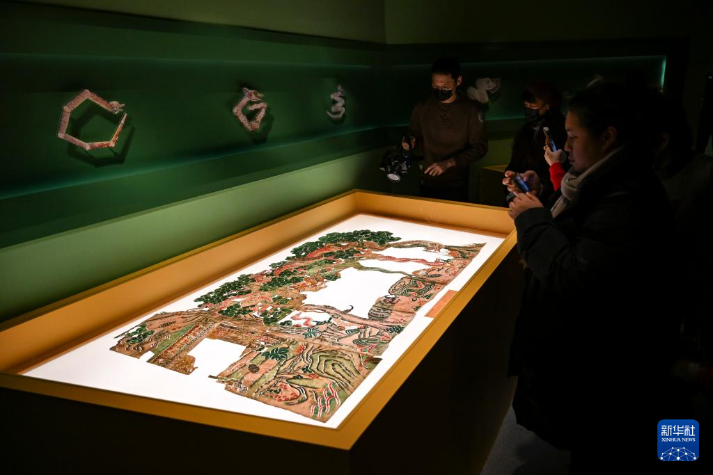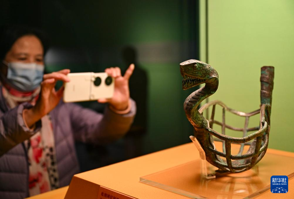 观众在上海博物馆蛇年迎春展拍摄展品蛇纲网状铜器(1月14日摄)。
