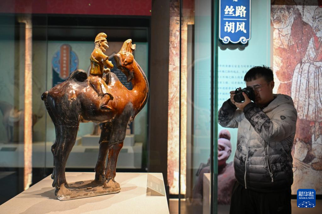 1月15日,观众在拍摄“长安三万里——陕西唐代文物精华展”展出的三彩胡人骑驼俑。