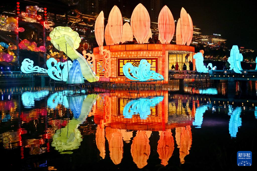 1月17日晚在湖北省宣恩县贡水河拍摄的彩灯。