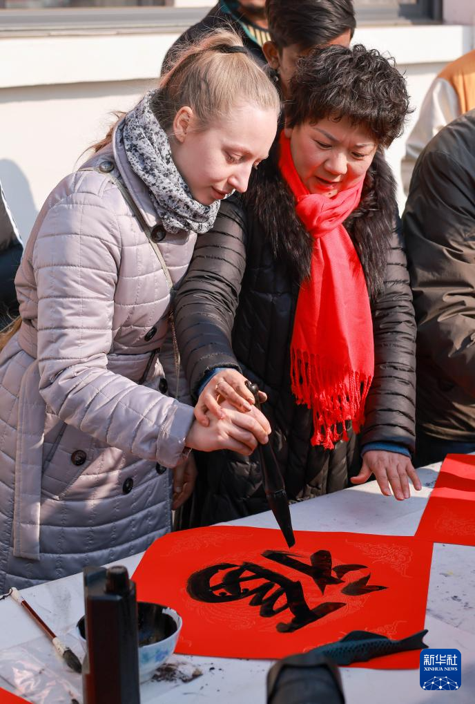 1月21日,在山东省枣庄市薛城区鲁封桥大集,外国留学生体验写春联。