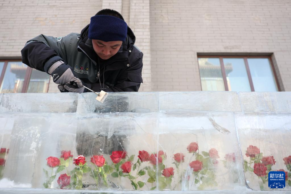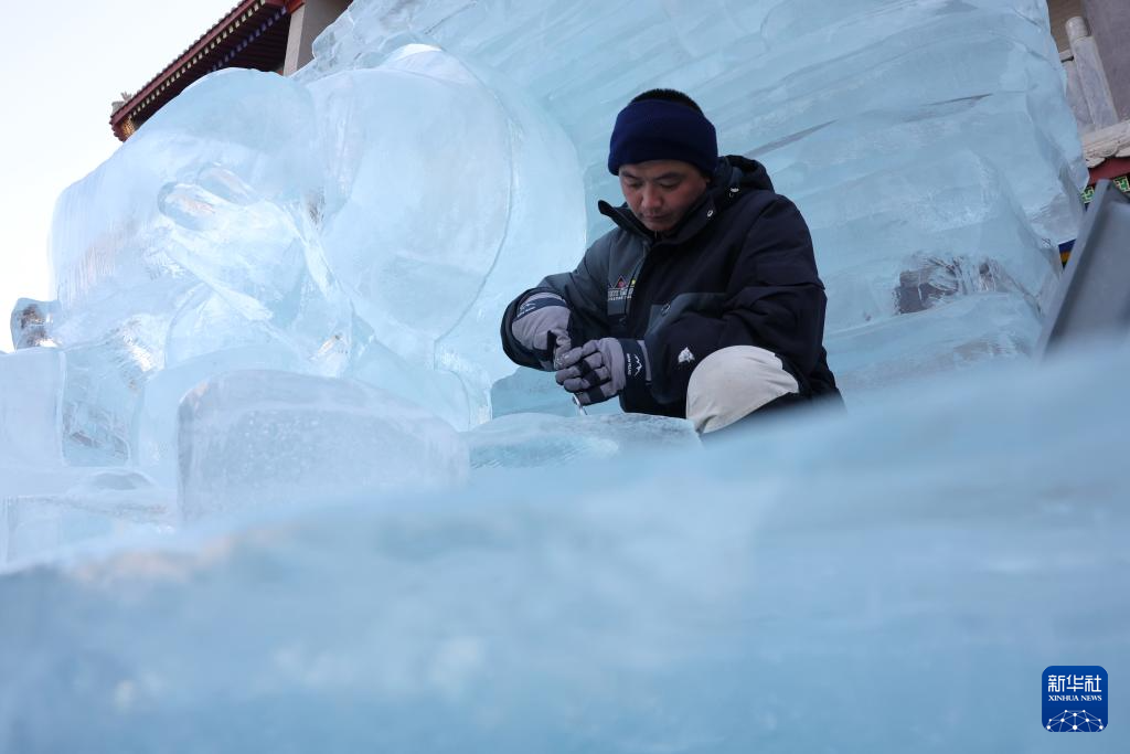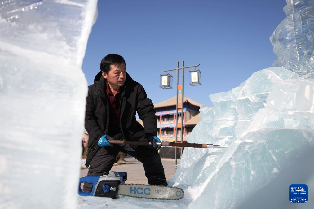 在甘肃省张掖市甘州区甘州府城景区内的冰雕展区,冰雕师赵浩在打磨一组冰雕作品(1月21日摄)。