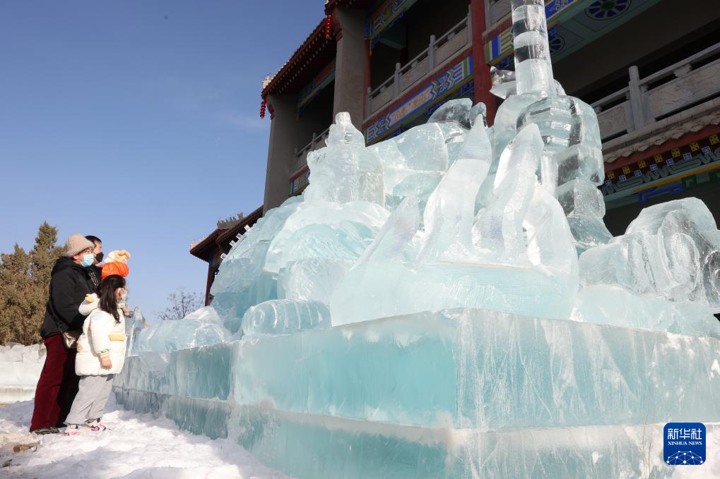 几名游客在甘肃省张掖市甘州区甘州府城景区内的冰雕展区内参观即将完工的冰雕作品(1月21日摄)。