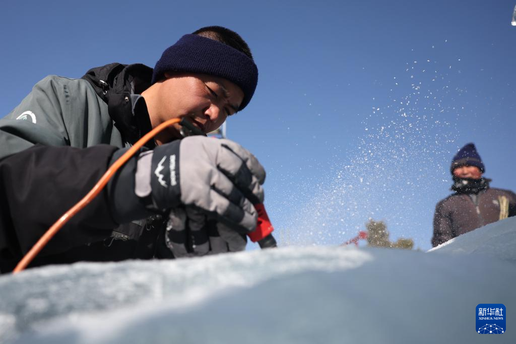 春节临近,在甘肃省张掖市甘州区甘州府城景区内,36岁的冰雕师赵浩和他的团队伙伴挥舞着工具,制作冰雕,为冰雕展做准备。