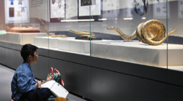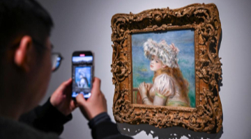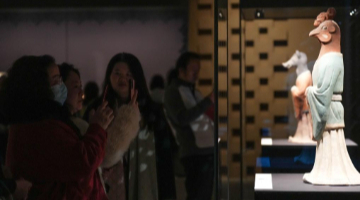 1月23日,一名小朋友在湖州吴兴的小西街西岸美术馆观赏年画美术作品。