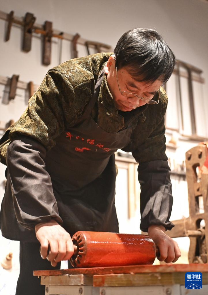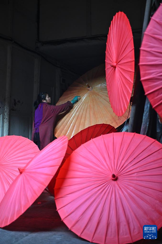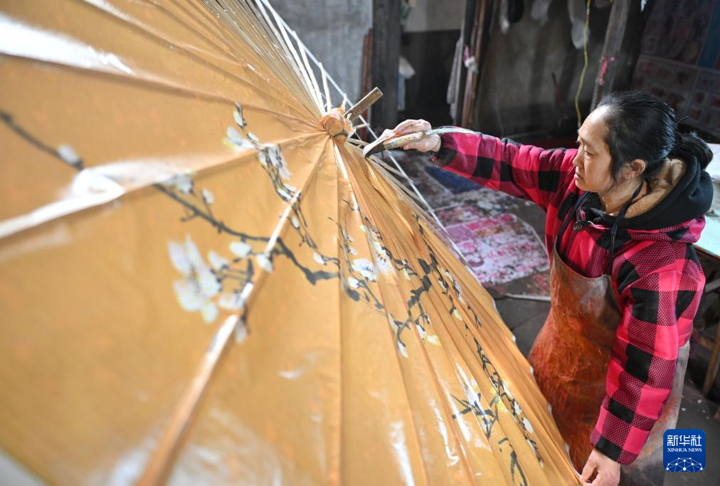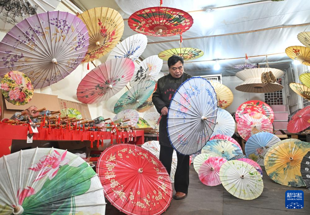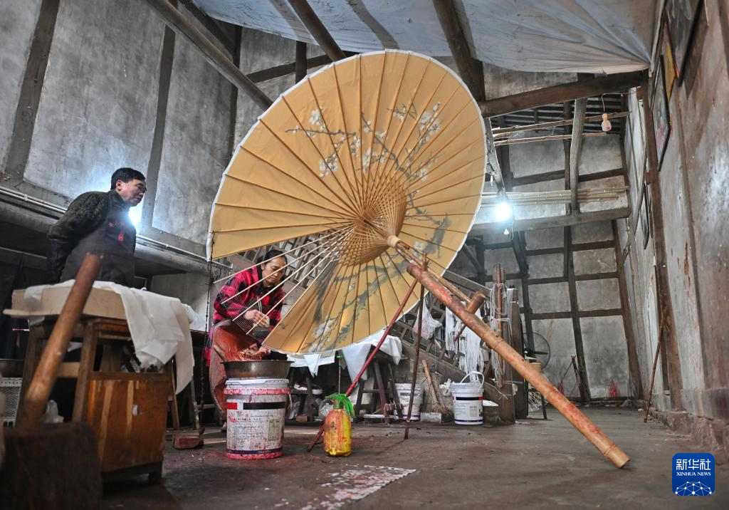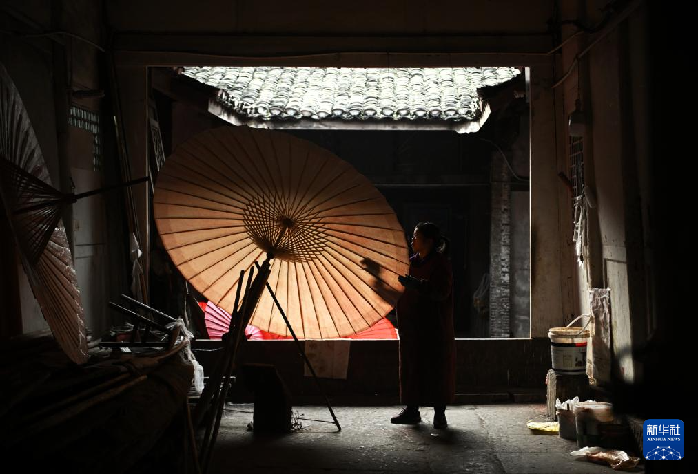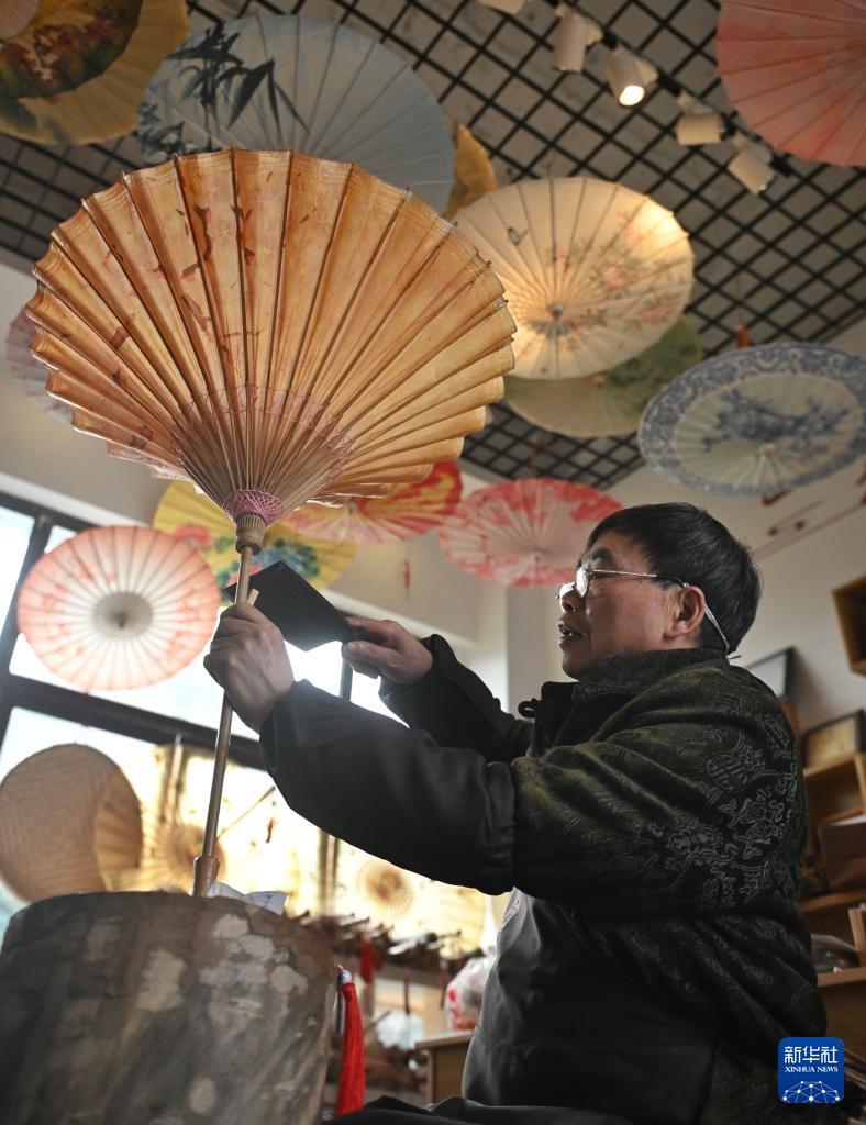 2月11日,制伞师在为油纸伞上桐油。
