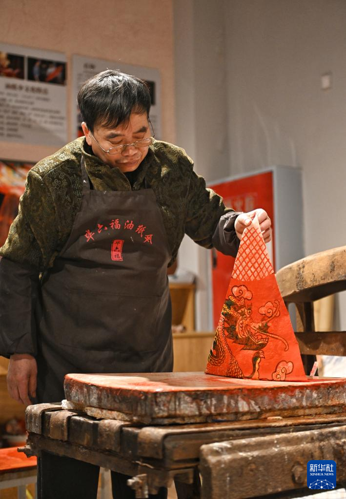 2月11日,毕六福在用石板印刷术制作油纸伞图案。