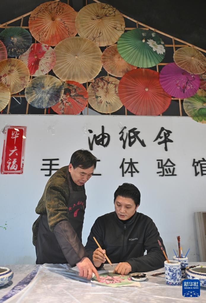 2月11日,毕六福(左)在指导制伞师制作油纸伞。