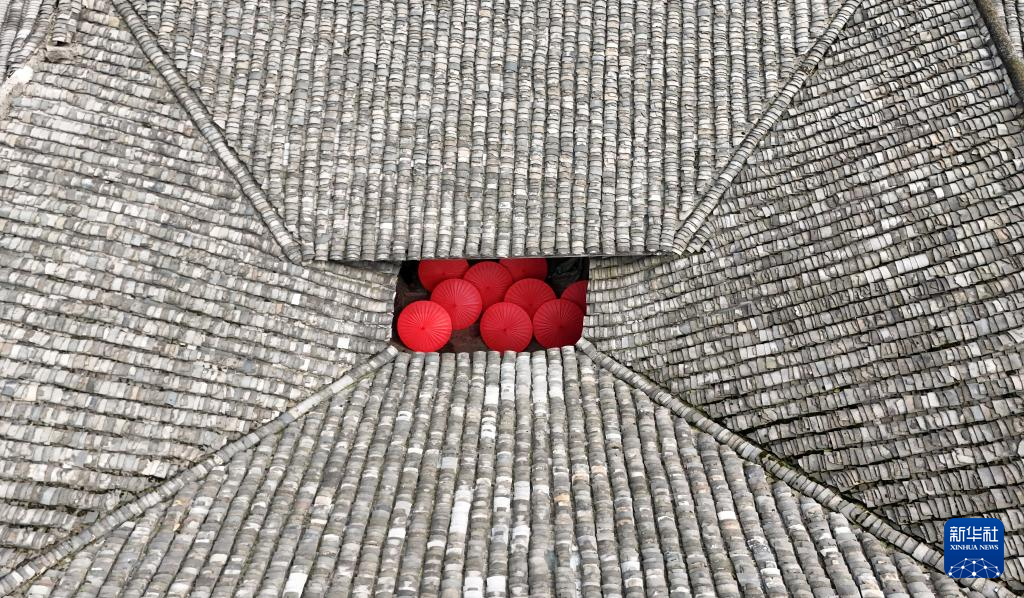 制伞师将油纸伞放到院子里晾晒(2月11日摄,无人机照片)。