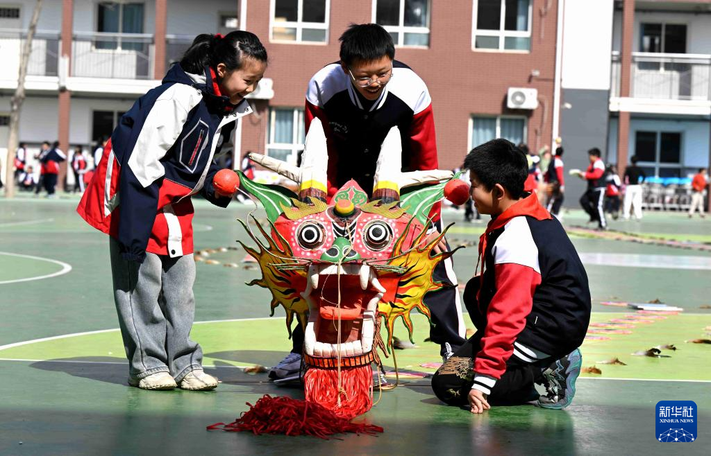 2月26日,石家庄市草场街小学学生在欣赏龙风筝。