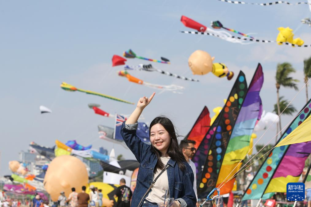 2月26日,一名女子在泰国芭堤雅海滩风筝节上留影。
