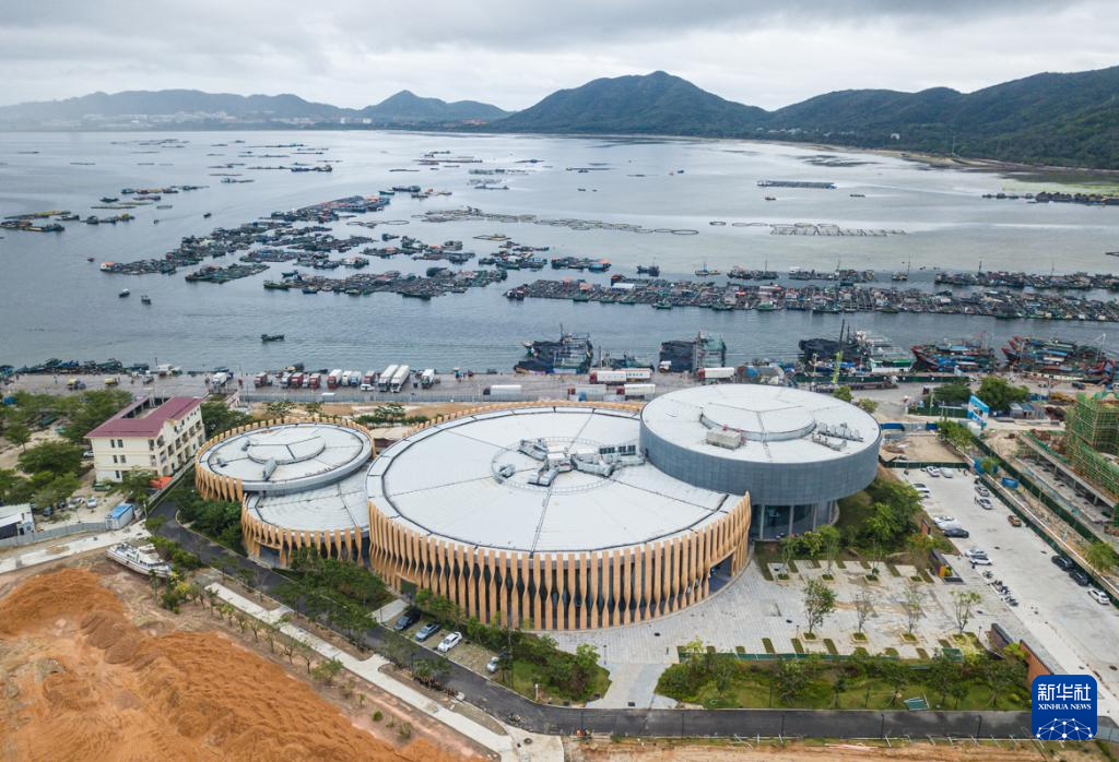 5月13日在海南陵水拍摄的海南疍家博物馆,该建筑外观形似“疍家帽”(无人机照片)。远处的海面上即是连片的疍家渔排。