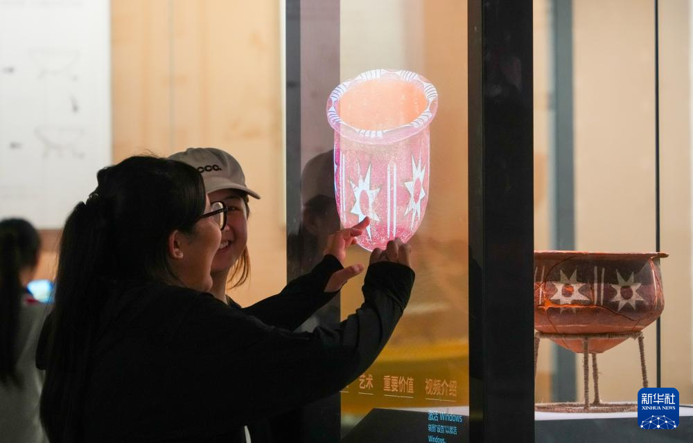 5月20日,人们在大汶口遗址博物馆通过多媒体设备多角度观看大汶口遗址出土的八角星纹彩陶豆。