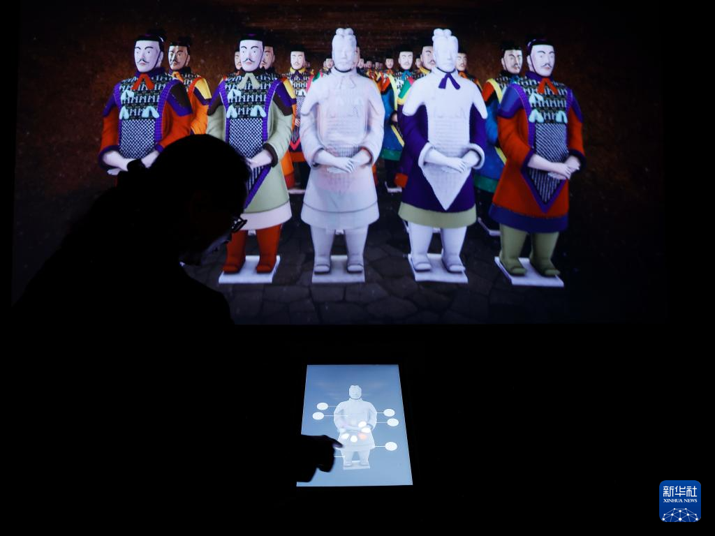 5月22日,嘉宾在美国加利福尼亚州奥兰治县宝尔博物馆通过平板电脑为兵马俑战士绘制彩色战衣。