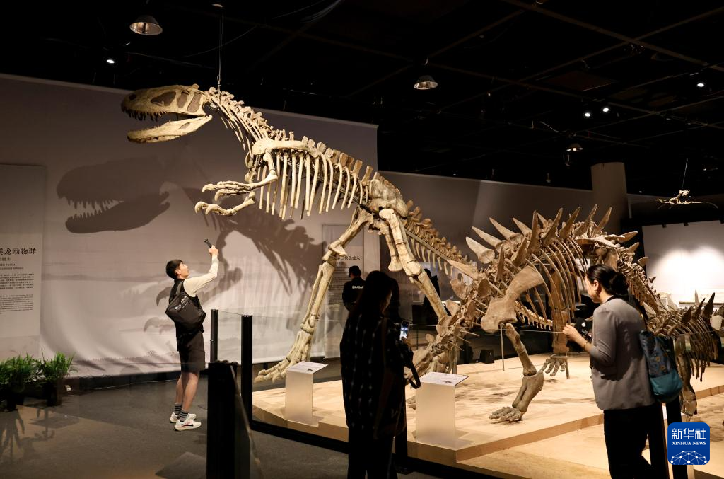 5月26日,参观者在一组恐龙群落化石展品前驻足。
