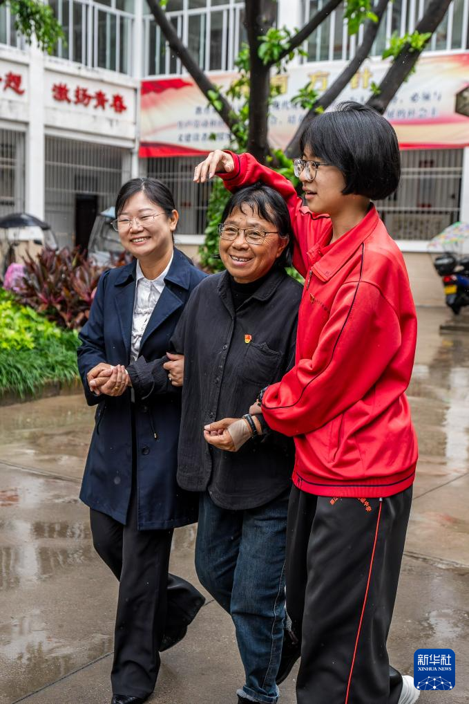5月27日,一名华坪女高学生(右)用手给张桂梅(中)挡雨。
