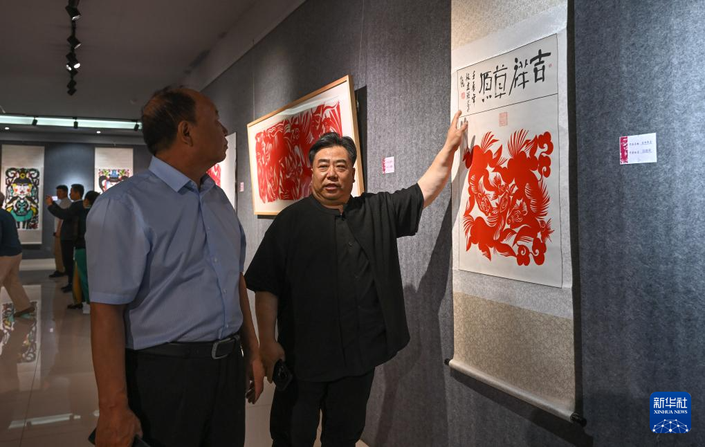 6月20日,和林格尔剪纸国家级代表性传承人段建珺(右)在呼和浩特职业学院美术馆向嘉宾介绍剪纸作品。