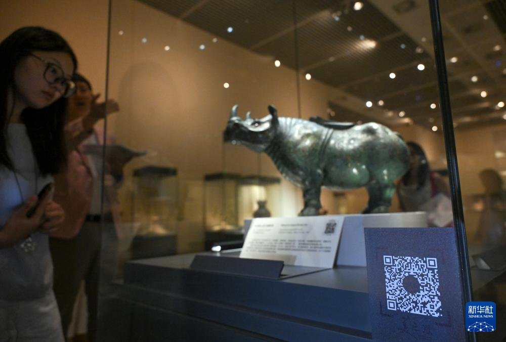 这是7月21日拍摄的错金银云纹青铜犀尊与“美之道”二维码。