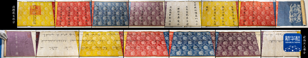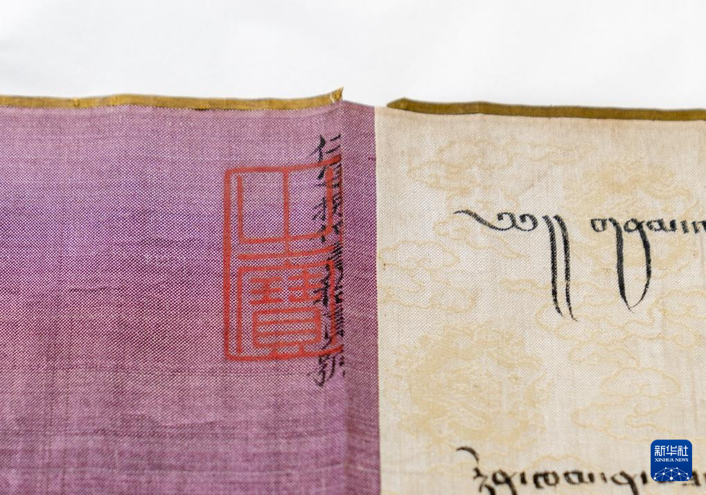 这是《永乐十一年封斡喃渴烈思巴为辅教王诰书》卷首(5月20日摄)。篆书“奉天诰命”四个字和双龙图案均是锦缎织造时应用提花技术以不同色彩的丝线织成。