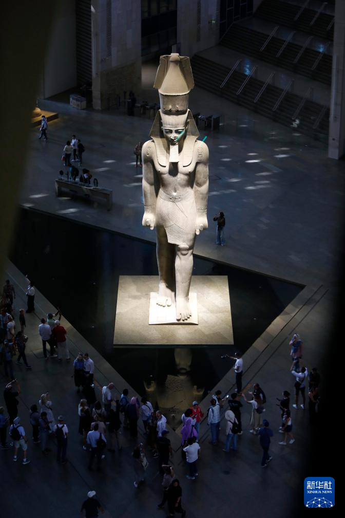 10月14日,在位于埃及吉萨省的大埃及博物馆,游客在古埃及法老拉美西斯二世的巨像旁参观。
