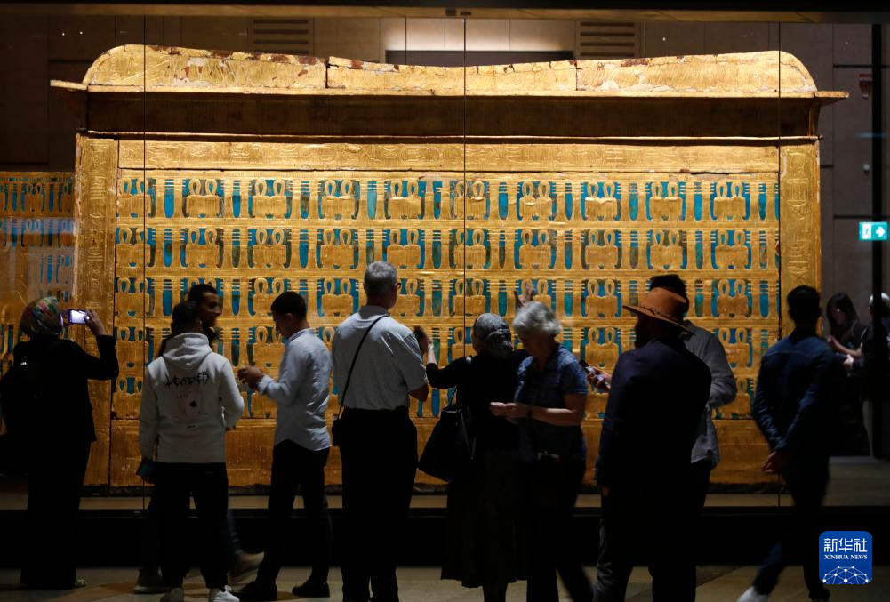 11月4日,在埃及吉萨的大埃及博物馆,游客在法老图坦卡蒙展馆参观金棺。