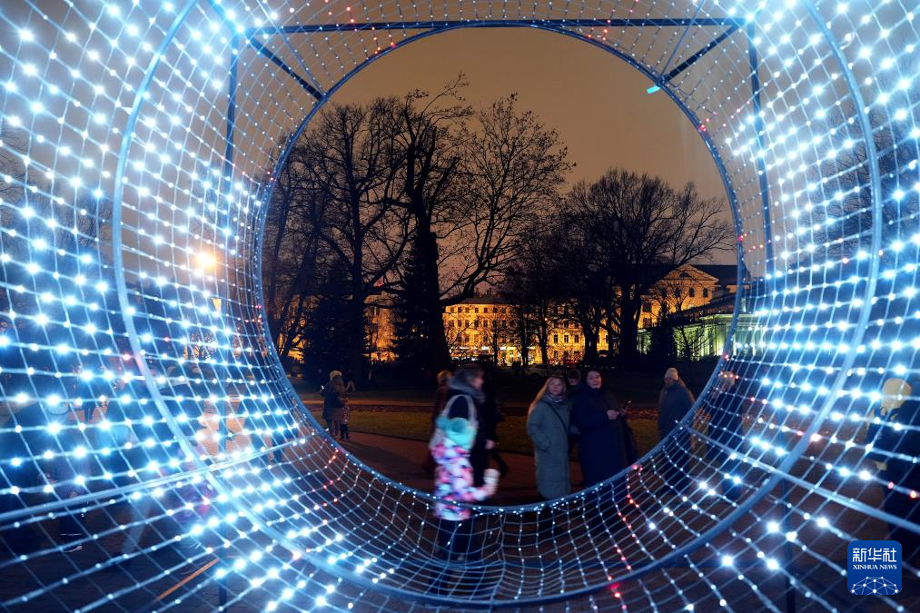 11月17日,民众在拉脱维亚首都里加举行的灯光节上欣赏滨海公园的灯光艺术装置。
